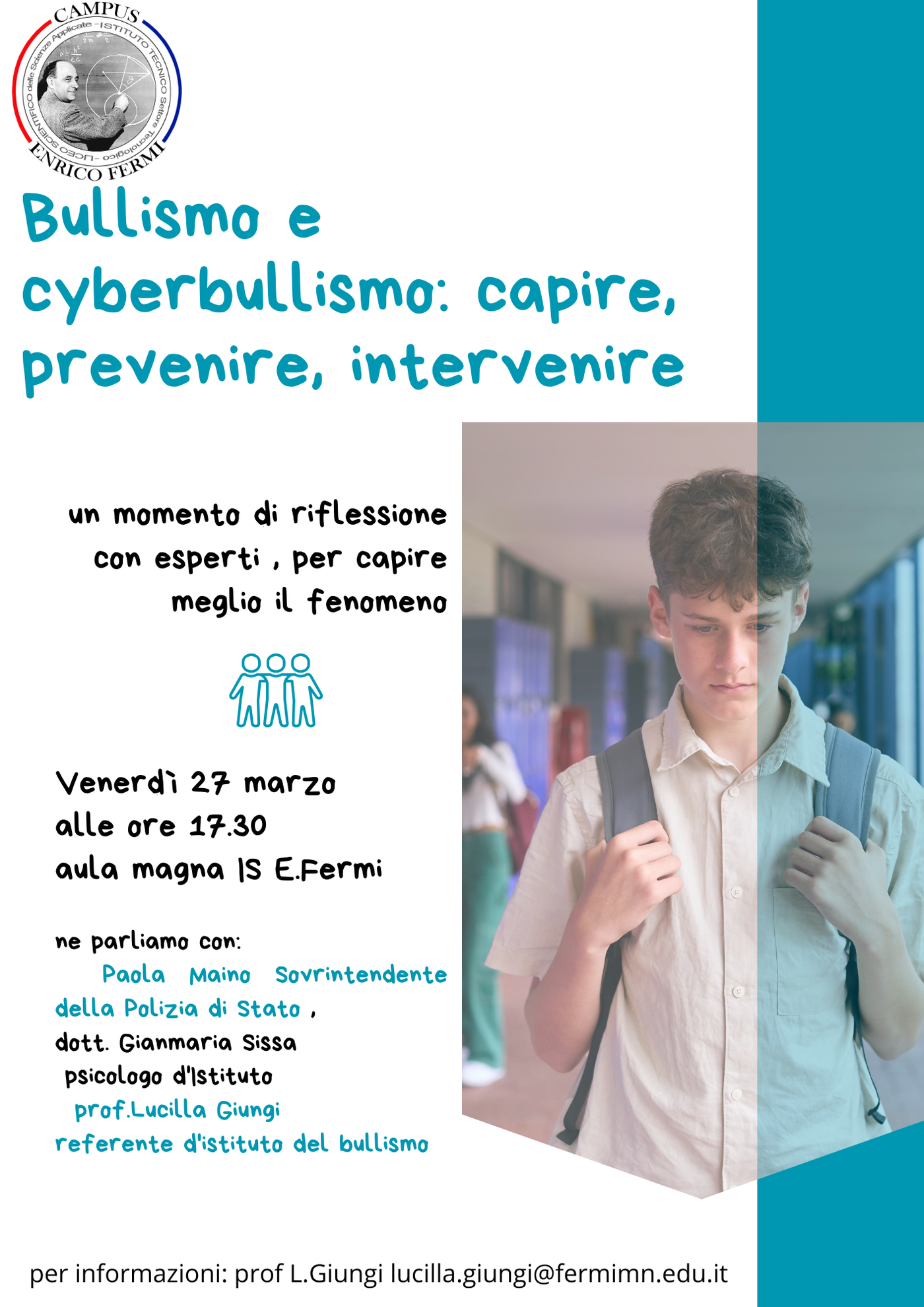 Venerdì 27 marzo alle ore 17.30 in aula 360 ne parliamo con la Sovrintendente della Polizia di Stato Paola Maino, lo psicologo d'Istituto dott. Gianmaria Sissa e la referente d'istituto del bullismo prof.Lucilla Giungi.
